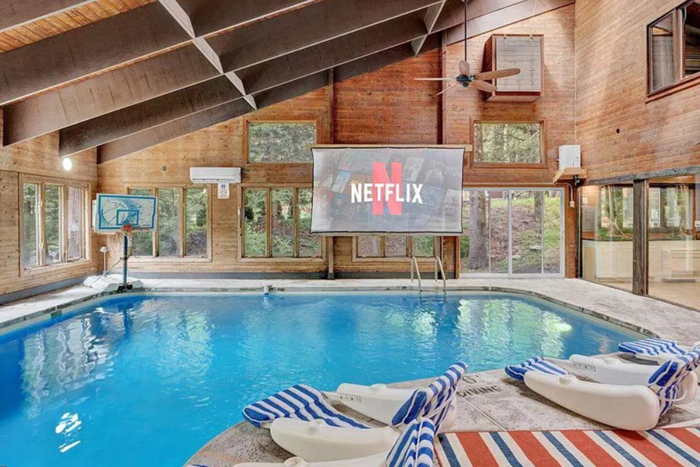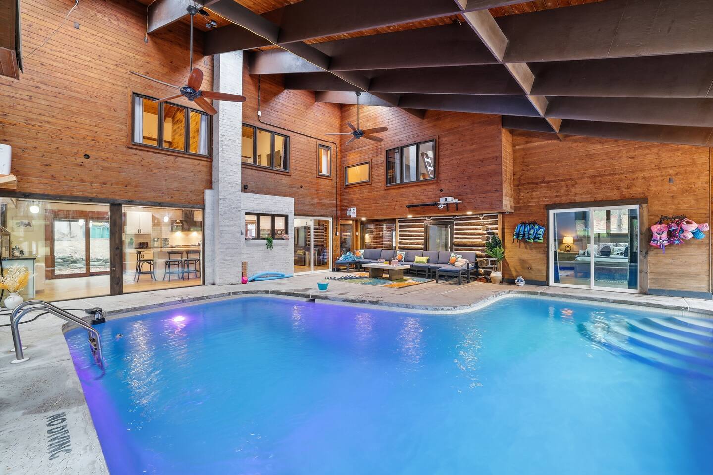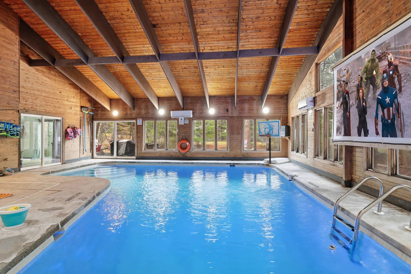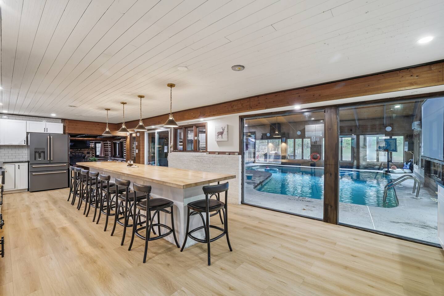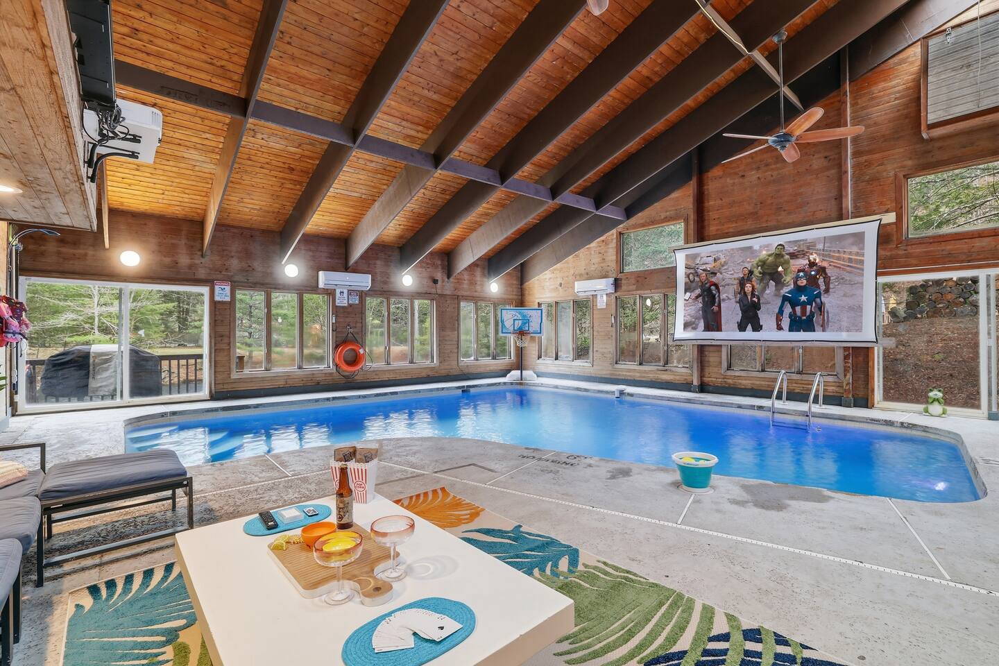 The Space The Rustic River Escape! KEY FEATURES: ☀ 6 bedrooms (perfect for large groups & families) ☀ 3 full bathrooms ☀ Fully Equipped Beautiful Kitchen with a large island for eating. ☀ Indoor Heated Pool with streaming projector ☀ Waterfront with large outdoor picnic table ☀ Outdoor Hot Tub ☀ Fire pit with Adirondack chairs ☀ BBQ ☀Pet Friendly ALL YEAR FUN *Great Wolf Lodge Indoor Water Park *Camelback Mountain Resort *Kalahari Resorts & Conventions Poconos *Delaware Water Gap National Recreation Area * Bushkill Creek *Mountain creek riding stables LAKE AND NATURE *Bushkill Creek *Delaware Water Gap National Recreation Area * Appalachian Trail access points - Hiking, biking, ATV trails - Skiing & snowboarding nearby in winter - Wildlife spotting (deer, turkey, occasional black bear) WINTER FUN *Shawnee Mountain Ski Area *Camelback Mountain Resort *Blue Mountain Resort *Jack Frost Ski Resort ☆☆ BEDROOM ☆☆ Level 2 Bedroom 1: King bed Bedroom 2: King bed Bedroom 3: 3 Twin beds Bedroom 4: 2 Twin beds Level 1 Bedroom 5: King bed Bedroom 6: Full bed ☆☆BATHROOMS☆☆ There are 3 full bathrooms stocked with all the essentials you need for the duration of your stay. ☆☆KITCHEN AND DINING☆☆ The kitchen is fully equipped with all appliances, utensils, and cookware you need to feel right at home. It also features a 16 seat dining table to enjoy meals with your family or friends. ☆☆LIVING ROOM☆☆ Our rustic living space where timeless cabin charm meets modern comfort. Soaring cathedral ceilings with exposed wood beams and skylights flood the room with natural light, while a stunning stone fireplace anchors the space for cozy evenings. Relax on the oversized leather sectional or gather with friends around the coffee table as your favorite shows play on the large smart TV. Direct access to the lake from the living room and make sure you also Make a wish on our wish tree! ☆☆LAUNDRY SPACE☆☆ Washer/dryer is accessible in the home. ☆☆POOL☆☆ ☀ 1,500+ sq ft private natatorium ☀ Heated saltwater L-shaped pool ☀ Natural light + creek-facing windows ☀ Space to swim, relax, or watch movies poolside ☆☆ OUTSIDE SPACE☆☆ ☀ 150+ ft direct Bushkill Creek frontage ☀ Mountain and water views in every direction ☀ Covered hot tub gazebo ☀ Picnic table and open yard for games & exploring ☀ BBQ ⭐⭐PROFESSIONALLY MANAGED⭐⭐ This home is managed by a luxury Pocono hospitality team dedicated to delivering 5-star stays and seamless guest experiences.