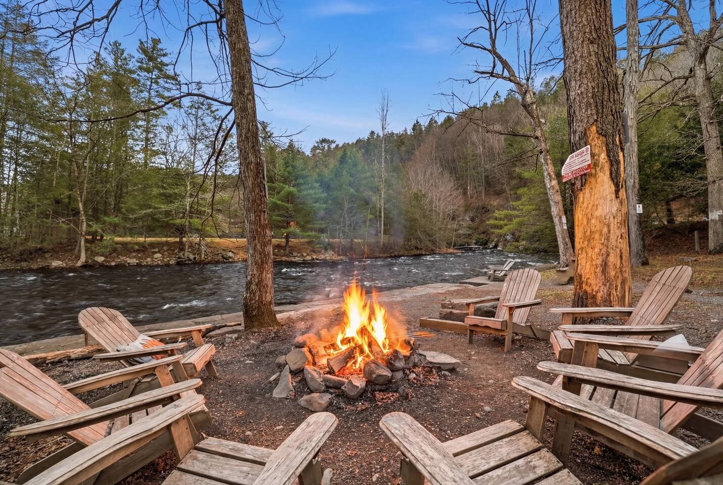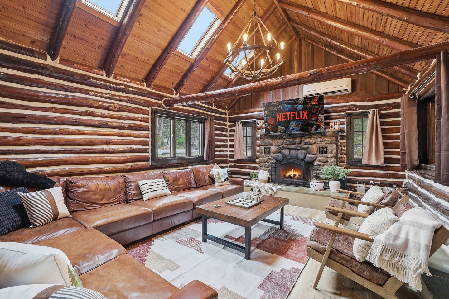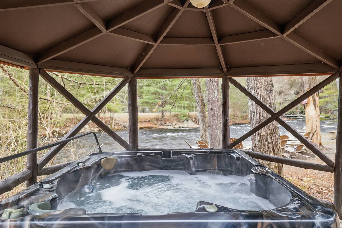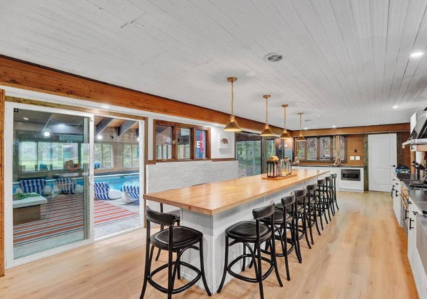 The Space The Rustic River Escape! KEY FEATURES: ☀ 6 bedrooms (perfect for large groups & families) ☀ 3 full bathrooms ☀ Fully Equipped Beautiful Kitchen with a large island for eating. ☀ Indoor Heated Pool with streaming projector ☀ Waterfront with large outdoor picnic table ☀ Outdoor Hot Tub ☀ Fire pit with Adirondack chairs ☀ BBQ ☀Pet Friendly ALL YEAR FUN *Great Wolf Lodge Indoor Water Park *Camelback Mountain Resort *Kalahari Resorts & Conventions Poconos *Delaware Water Gap National Recreation Area * Bushkill Creek *Mountain creek riding stables LAKE AND NATURE *Bushkill Creek *Delaware Water Gap National Recreation Area * Appalachian Trail access points - Hiking, biking, ATV trails - Skiing & snowboarding nearby in winter - Wildlife spotting (deer, turkey, occasional black bear) WINTER FUN *Shawnee Mountain Ski Area *Camelback Mountain Resort *Blue Mountain Resort *Jack Frost Ski Resort ☆☆ BEDROOM ☆☆ Level 2 Bedroom 1: King bed Bedroom 2: King bed Bedroom 3: 3 Twin beds Bedroom 4: 2 Twin beds Level 1 Bedroom 5: King bed Bedroom 6: Full bed ☆☆BATHROOMS☆☆ There are 3 full bathrooms stocked with all the essentials you need for the duration of your stay. ☆☆KITCHEN AND DINING☆☆ The kitchen is fully equipped with all appliances, utensils, and cookware you need to feel right at home. It also features a 16 seat dining table to enjoy meals with your family or friends. ☆☆LIVING ROOM☆☆ Our rustic living space where timeless cabin charm meets modern comfort. Soaring cathedral ceilings with exposed wood beams and skylights flood the room with natural light, while a stunning stone fireplace anchors the space for cozy evenings. Relax on the oversized leather sectional or gather with friends around the coffee table as your favorite shows play on the large smart TV. Direct access to the lake from the living room and make sure you also Make a wish on our wish tree! ☆☆LAUNDRY SPACE☆☆ Washer/dryer is accessible in the home. ☆☆POOL☆☆ ☀ 1,500+ sq ft private natatorium ☀ Heated saltwater L-shaped pool ☀ Natural light + creek-facing windows ☀ Space to swim, relax, or watch movies poolside ☆☆ OUTSIDE SPACE☆☆ ☀ 150+ ft direct Bushkill Creek frontage ☀ Mountain and water views in every direction ☀ Covered hot tub gazebo ☀ Picnic table and open yard for games & exploring ☀ BBQ ⭐⭐PROFESSIONALLY MANAGED⭐⭐ This home is managed by a luxury Pocono hospitality team dedicated to delivering 5-star stays and seamless guest experiences.