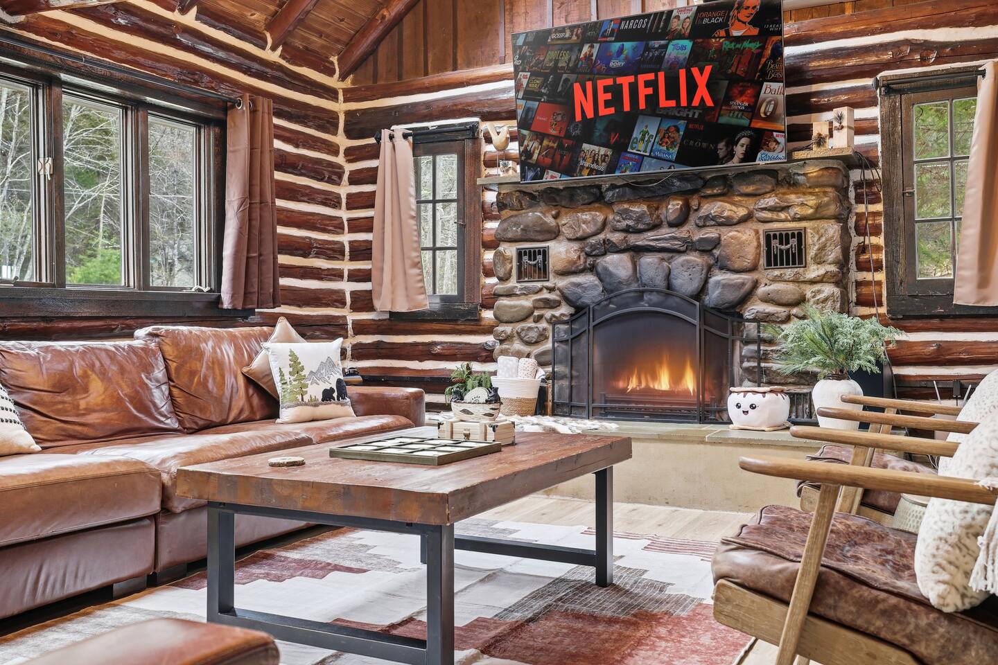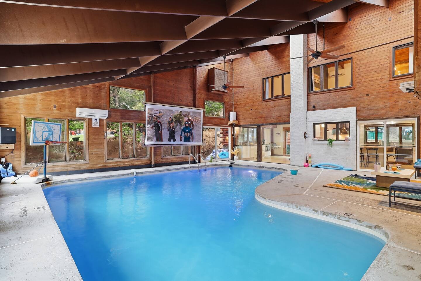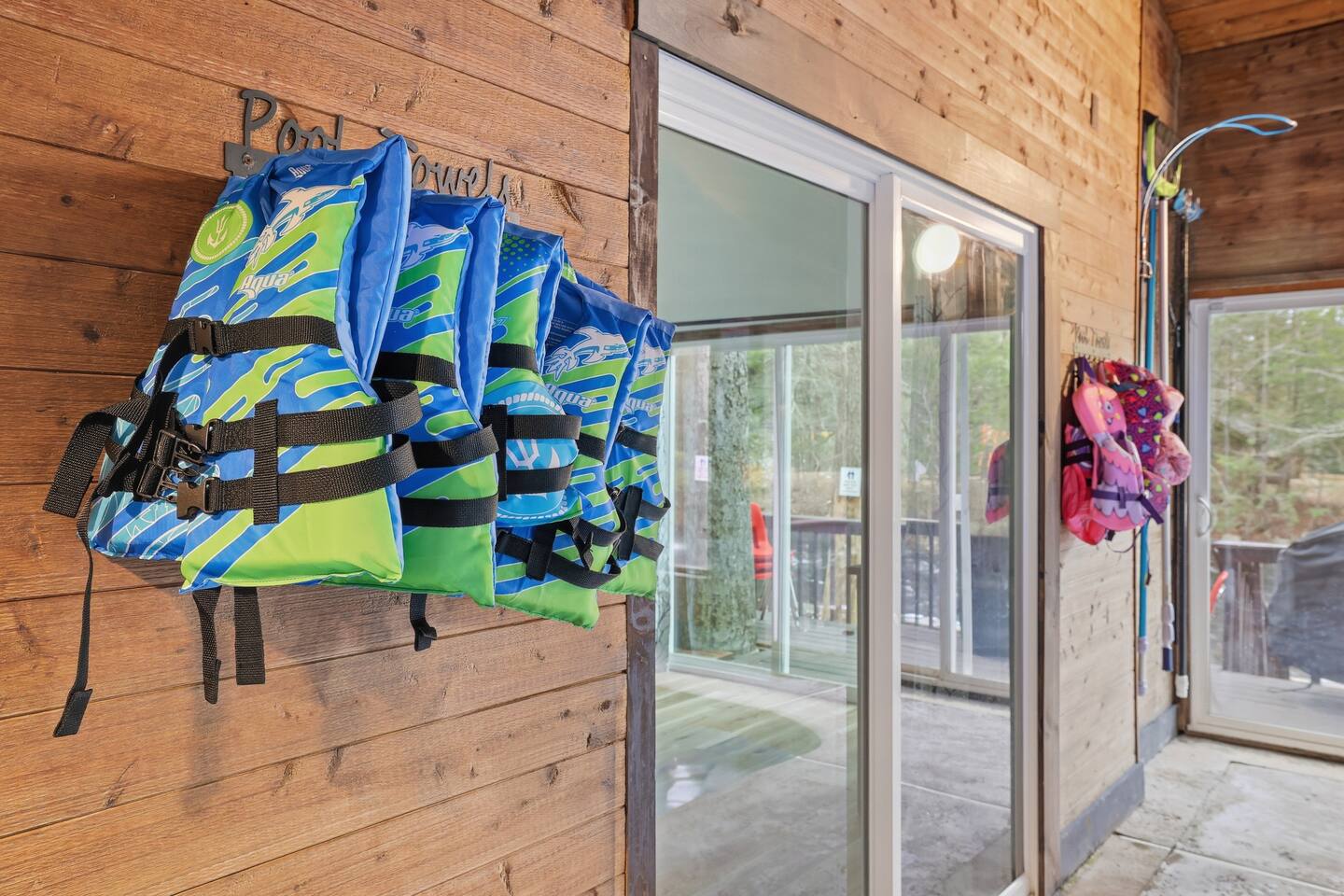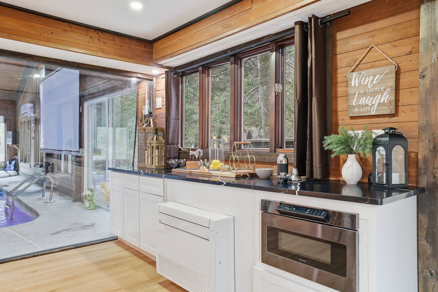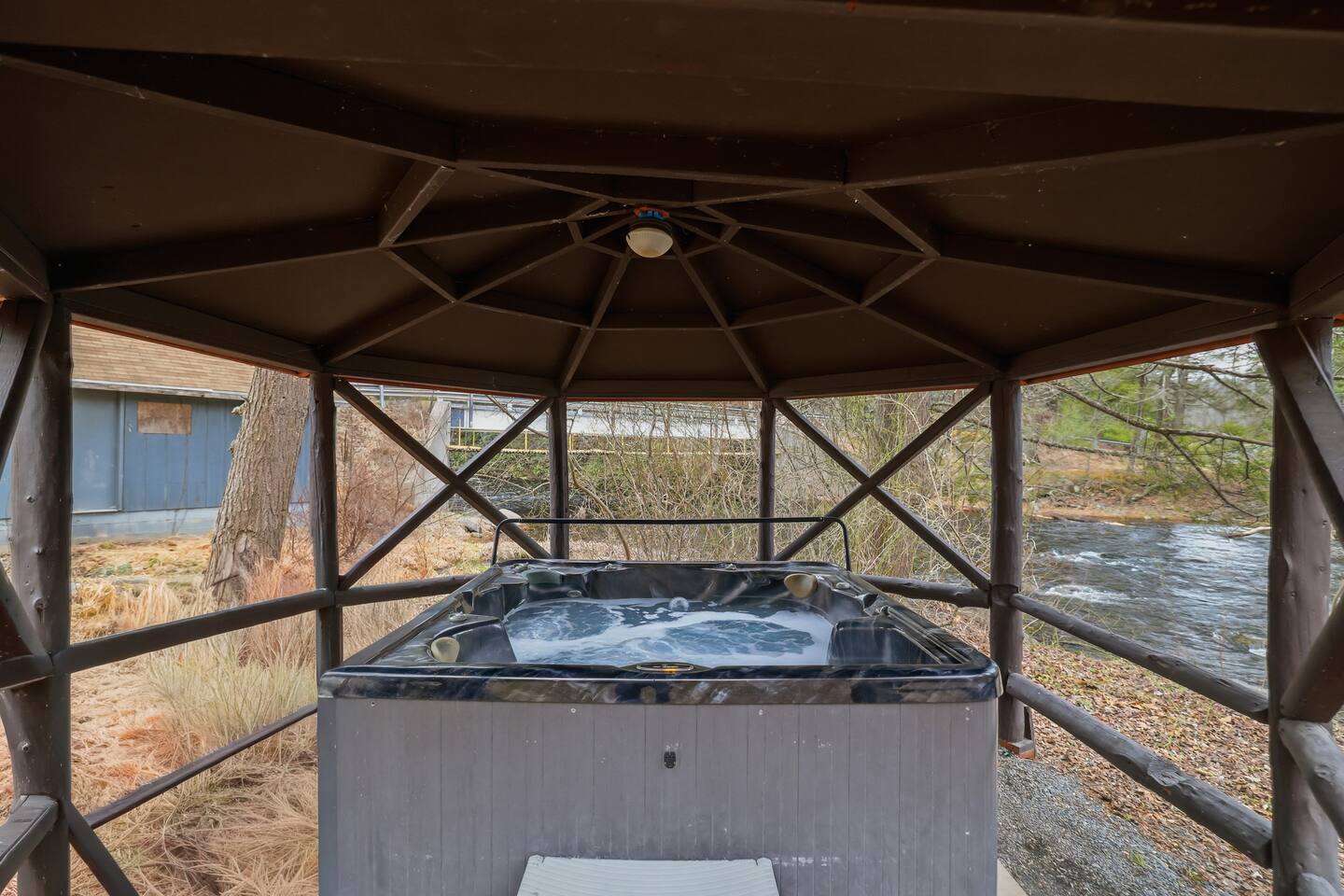 The Space The Rustic River Escape! KEY FEATURES: ☀ 6 bedrooms (perfect for large groups & families) ☀ 3 full bathrooms ☀ Fully Equipped Beautiful Kitchen with a large island for eating. ☀ Indoor Heated Pool with streaming projector ☀ Waterfront with large outdoor picnic table ☀ Outdoor Hot Tub ☀ Fire pit with Adirondack chairs ☀ BBQ ☀Pet Friendly ALL YEAR FUN *Great Wolf Lodge Indoor Water Park *Camelback Mountain Resort *Kalahari Resorts & Conventions Poconos *Delaware Water Gap National Recreation Area * Bushkill Creek *Mountain creek riding stables LAKE AND NATURE *Bushkill Creek *Delaware Water Gap National Recreation Area * Appalachian Trail access points - Hiking, biking, ATV trails - Skiing & snowboarding nearby in winter - Wildlife spotting (deer, turkey, occasional black bear) WINTER FUN *Shawnee Mountain Ski Area *Camelback Mountain Resort *Blue Mountain Resort *Jack Frost Ski Resort ☆☆ BEDROOM ☆☆ Level 2 Bedroom 1: King bed Bedroom 2: King bed Bedroom 3: 3 Twin beds Bedroom 4: 2 Twin beds Level 1 Bedroom 5: King bed Bedroom 6: Full bed ☆☆BATHROOMS☆☆ There are 3 full bathrooms stocked with all the essentials you need for the duration of your stay. ☆☆KITCHEN AND DINING☆☆ The kitchen is fully equipped with all appliances, utensils, and cookware you need to feel right at home. It also features a 16 seat dining table to enjoy meals with your family or friends. ☆☆LIVING ROOM☆☆ Our rustic living space where timeless cabin charm meets modern comfort. Soaring cathedral ceilings with exposed wood beams and skylights flood the room with natural light, while a stunning stone fireplace anchors the space for cozy evenings. Relax on the oversized leather sectional or gather with friends around the coffee table as your favorite shows play on the large smart TV. Direct access to the lake from the living room and make sure you also Make a wish on our wish tree! ☆☆LAUNDRY SPACE☆☆ Washer/dryer is accessible in the home. ☆☆POOL☆☆ ☀ 1,500+ sq ft private natatorium ☀ Heated saltwater L-shaped pool ☀ Natural light + creek-facing windows ☀ Space to swim, relax, or watch movies poolside ☆☆ OUTSIDE SPACE☆☆ ☀ 150+ ft direct Bushkill Creek frontage ☀ Mountain and water views in every direction ☀ Covered hot tub gazebo ☀ Picnic table and open yard for games & exploring ☀ BBQ ⭐⭐PROFESSIONALLY MANAGED⭐⭐ This home is managed by a luxury Pocono hospitality team dedicated to delivering 5-star stays and seamless guest experiences.