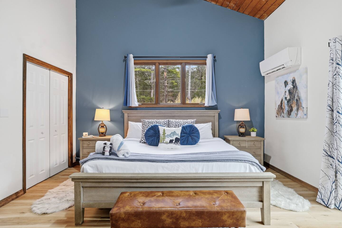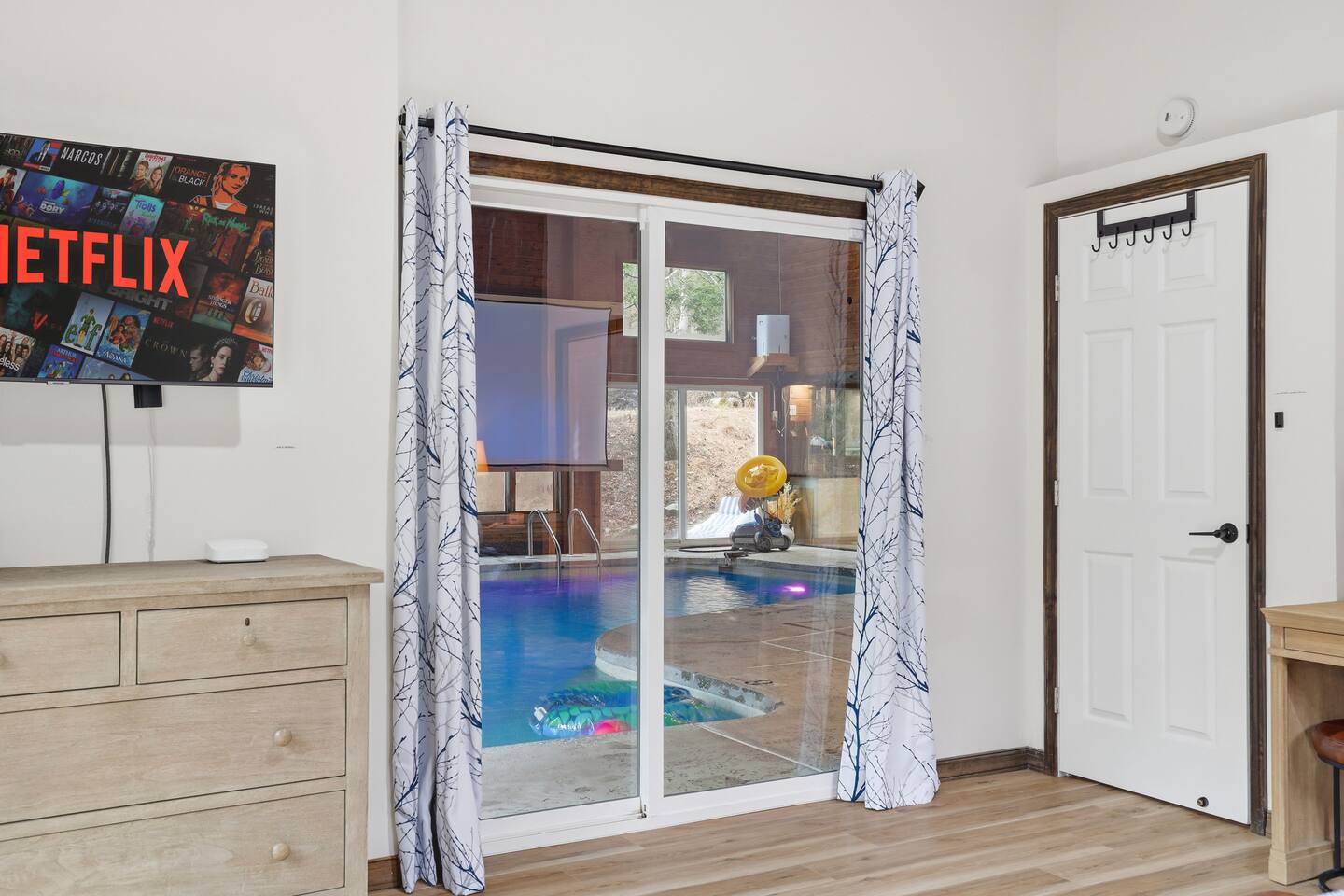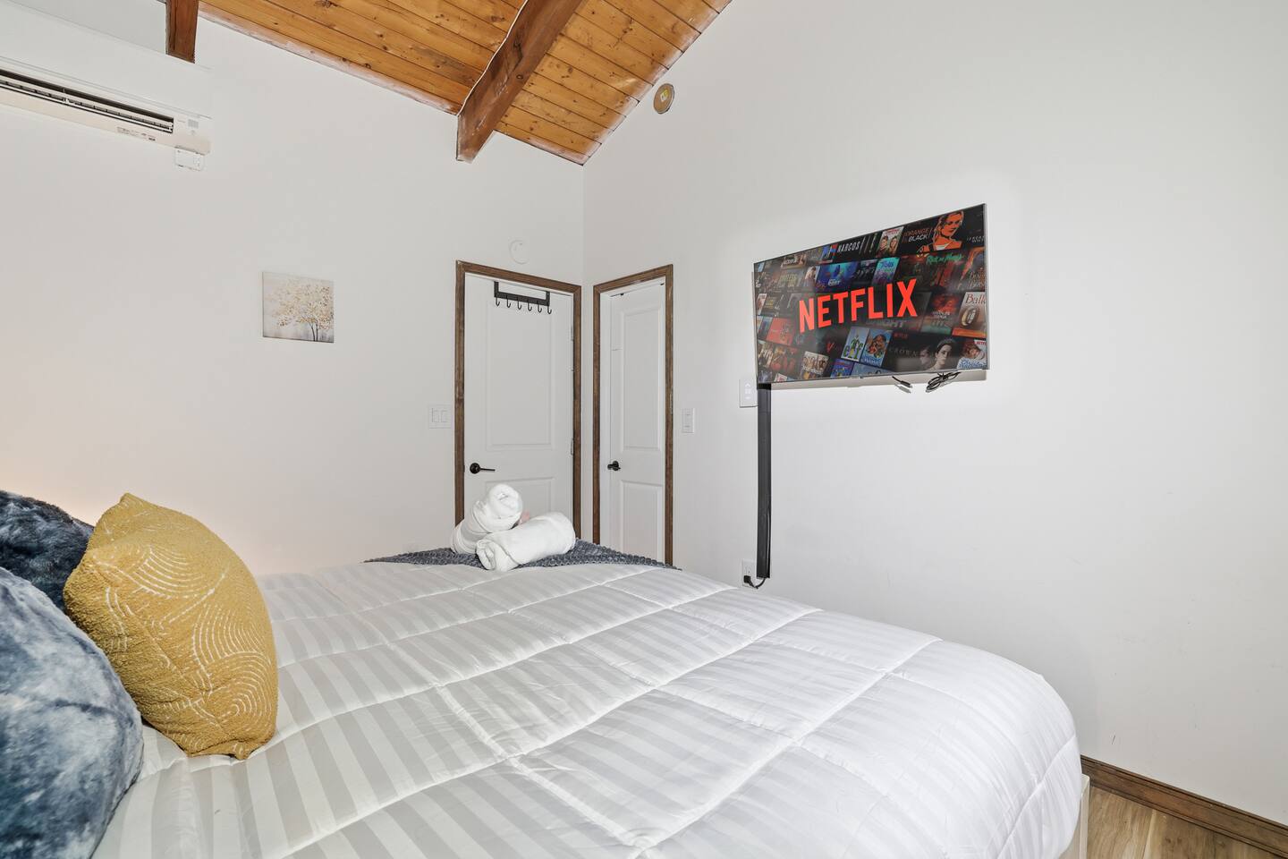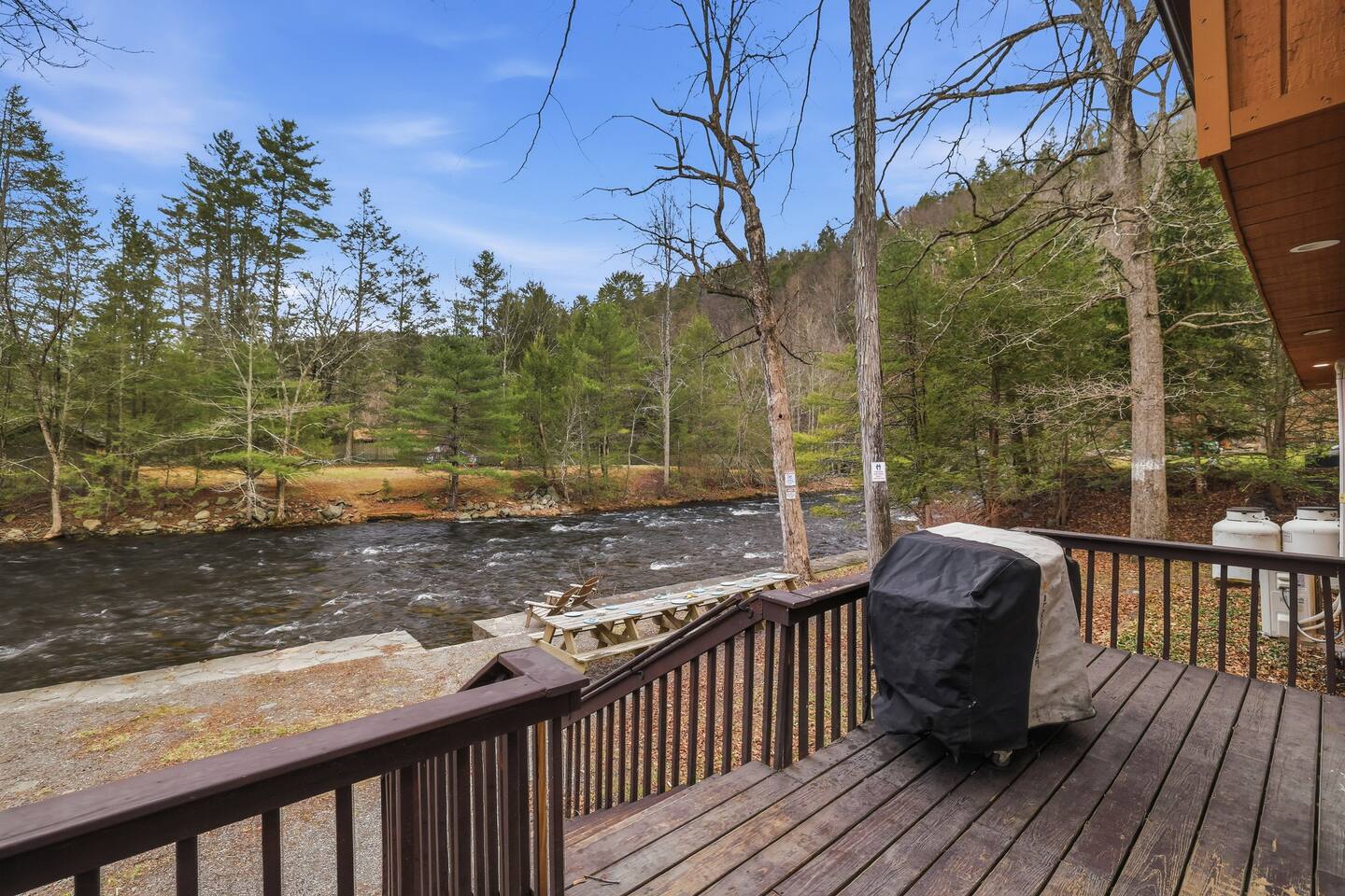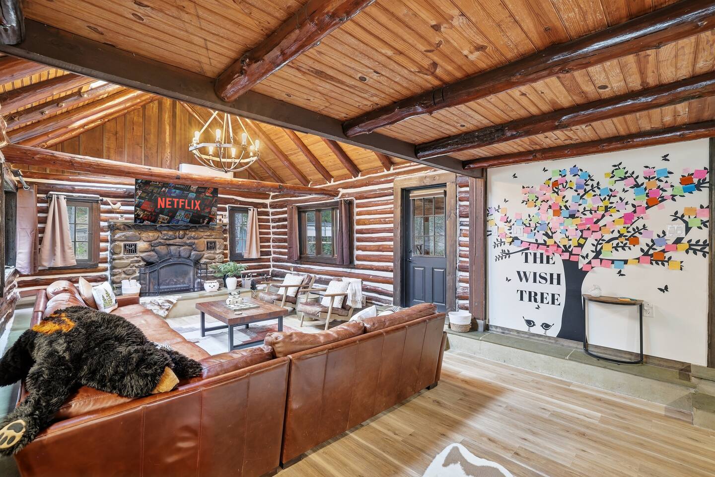 The Space The Rustic River Escape! KEY FEATURES: ☀ 6 bedrooms (perfect for large groups & families) ☀ 3 full bathrooms ☀ Fully Equipped Beautiful Kitchen with a large island for eating. ☀ Indoor Heated Pool with streaming projector ☀ Waterfront with large outdoor picnic table ☀ Outdoor Hot Tub ☀ Fire pit with Adirondack chairs ☀ BBQ ☀Pet Friendly ALL YEAR FUN *Great Wolf Lodge Indoor Water Park *Camelback Mountain Resort *Kalahari Resorts & Conventions Poconos *Delaware Water Gap National Recreation Area * Bushkill Creek *Mountain creek riding stables LAKE AND NATURE *Bushkill Creek *Delaware Water Gap National Recreation Area * Appalachian Trail access points - Hiking, biking, ATV trails - Skiing & snowboarding nearby in winter - Wildlife spotting (deer, turkey, occasional black bear) WINTER FUN *Shawnee Mountain Ski Area *Camelback Mountain Resort *Blue Mountain Resort *Jack Frost Ski Resort ☆☆ BEDROOM ☆☆ Level 2 Bedroom 1: King bed Bedroom 2: King bed Bedroom 3: 3 Twin beds Bedroom 4: 2 Twin beds Level 1 Bedroom 5: King bed Bedroom 6: Full bed ☆☆BATHROOMS☆☆ There are 3 full bathrooms stocked with all the essentials you need for the duration of your stay. ☆☆KITCHEN AND DINING☆☆ The kitchen is fully equipped with all appliances, utensils, and cookware you need to feel right at home. It also features a 16 seat dining table to enjoy meals with your family or friends. ☆☆LIVING ROOM☆☆ Our rustic living space where timeless cabin charm meets modern comfort. Soaring cathedral ceilings with exposed wood beams and skylights flood the room with natural light, while a stunning stone fireplace anchors the space for cozy evenings. Relax on the oversized leather sectional or gather with friends around the coffee table as your favorite shows play on the large smart TV. Direct access to the lake from the living room and make sure you also Make a wish on our wish tree! ☆☆LAUNDRY SPACE☆☆ Washer/dryer is accessible in the home. ☆☆POOL☆☆ ☀ 1,500+ sq ft private natatorium ☀ Heated saltwater L-shaped pool ☀ Natural light + creek-facing windows ☀ Space to swim, relax, or watch movies poolside ☆☆ OUTSIDE SPACE☆☆ ☀ 150+ ft direct Bushkill Creek frontage ☀ Mountain and water views in every direction ☀ Covered hot tub gazebo ☀ Picnic table and open yard for games & exploring ☀ BBQ ⭐⭐PROFESSIONALLY MANAGED⭐⭐ This home is managed by a luxury Pocono hospitality team dedicated to delivering 5-star stays and seamless guest experiences.