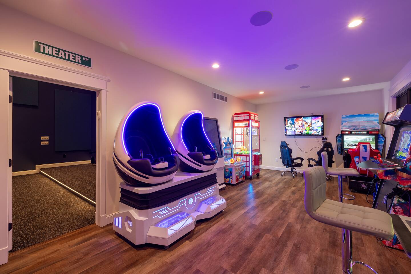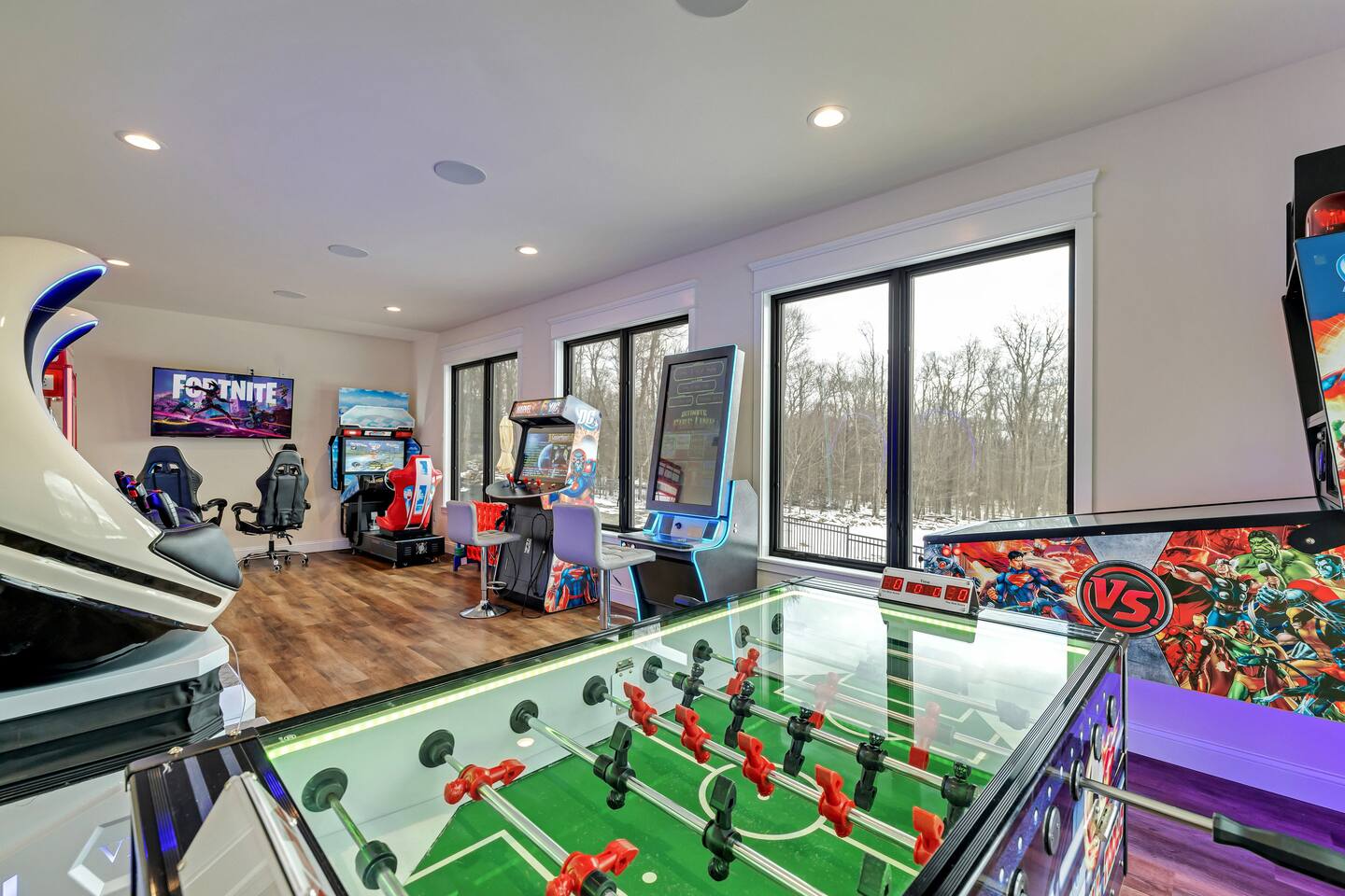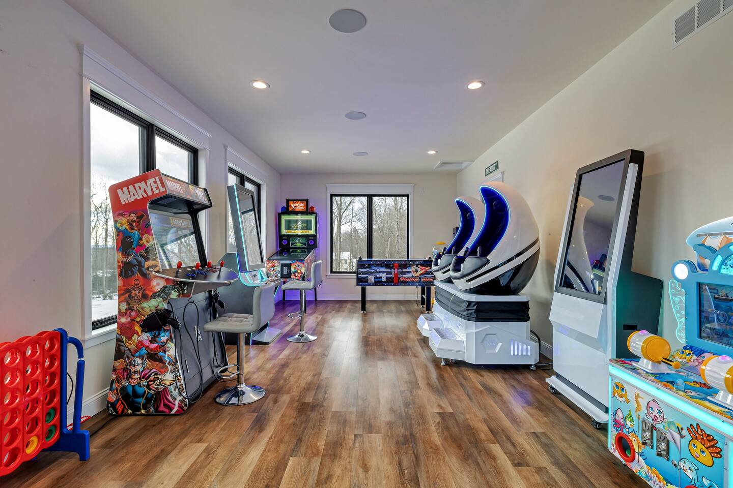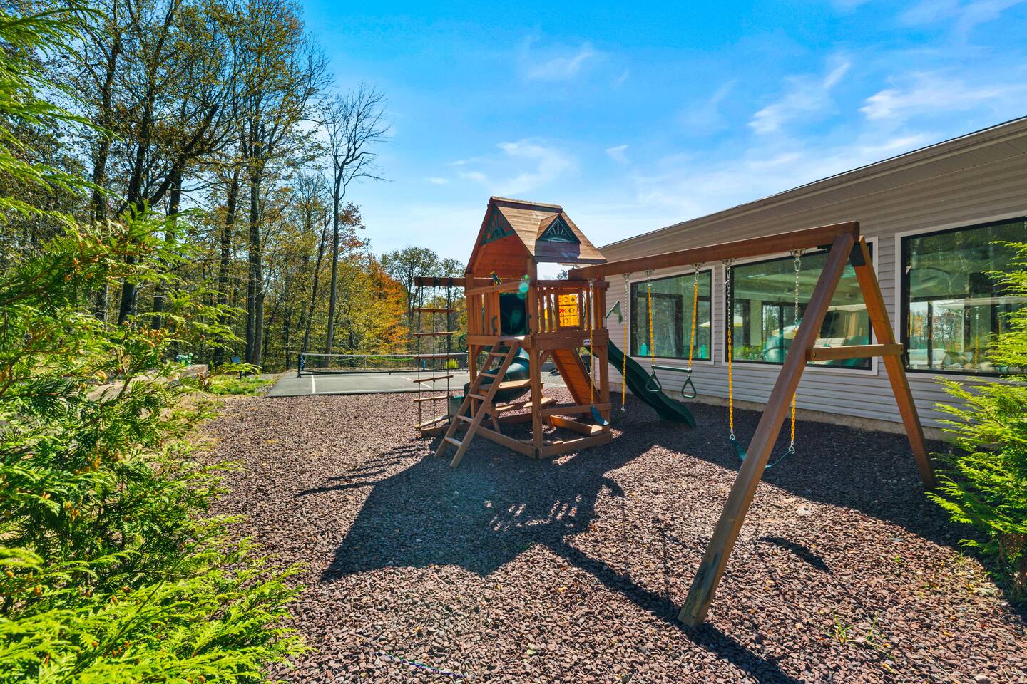 The Space The Perfect Pocono Escape! KEY FEATURES: ☀ 6 Bedroom, 6.5 Bathroom ☀ Fully Equipped Beautiful Kitchen ☀ Indoor Heated Pool and Hot tub ☀ Arcade Room (Virtual Reality, Casino, Gaming) ☀ State of the Art 2 Story Movie Theater ☀ Outdoor Hot Tub ☀ Fire pit ☀ BBQ ☀ Kids Playground & Basketball Court ☀ Pickle ball court ☀Private trail on property ☀ Universal Electric Car Charger ☀ Sonos Wireless Speaker System and so much more! ☆☆ The Perfect Pocono Escape is #1 Luxurious home in the Poconos Region! ☆☆ HALLOWEEN PARTY 🍁🎃🍂 Stop by ShawneeCraft Brewing Company for their annual Halloween Party on Friday, October 31. There will be prizes and giveaways for best costumes and mummy wrapping contest. Enjoy live music by the Sol Katana Band from 7-10 p.m. Free entry for all! Come stay at The Perfect Escape for all year round fun! Winter Fun: * Big Boulder Mountain * Jack Frost Ski Resort * Camelback Mountain Resort & Snow tubing Make a Splash: * Split Rock Resort * Camelback Outdoor waterpark * Kalahari Resort * Great Wolf Lodge * Aquatopia All Year Fun * Pocono Outdoor Adventure * Stock Car Racing * Pohopoco Tract ATV Trail * Tippmann Castle * Pocono Mountains * Wonderland Madhouse (mini-golf, escape the rooms, wine tasting) Lake & Nature Livin: * Big Boulder Lake * Austin T. Blakeslee Natural Area * Lake Harmony * Towamensing Trails * Hawk Falls * Hickory Run State Park * Pine Tree Lake * Stillwater Lake * Buttermilk Falls at Bear Creek Preserve * Summit Lake * Tobyhanna State Game Park ☆☆ BEDROOM ☆☆ First Level: Bedroom 1: 1 King Bed (master with private en suite) Bedroom 2: 2 Double Beds Bedroom 3: 3 Twin Bunk Beds (with 1 trundle) Second Level: Bedroom 4: 1 King Bed (master with private en suite) Bedroom 5: 2 Double Beds Bedroom 6: 3 Twin Bunk Beds (with 1 trundle) ☆☆BATHROOMS☆☆ There are 6.5 bathrooms stocked with all the essentials you need for the duration of your stay. The master bedrooms (2) feature custom made walk in showers featuring six body sprays and a bath tub. ☆☆KITCHEN & LOUNGE☆☆ The kitchen is fully equipped with all appliances, utensils, and cookware you need to feel right at home. It also features a 20 seat dinning table to enjoy meals with your family or friends. ☆☆LIVING ROOM☆☆ Our beautifully appointed living room boasting an impressive 83-inch 4K TV the ultimate centerpiece for entertainment enthusiasts. Sink into plush sofas and immerse yourself in your favorite shows or movies. Whether it's a movie night with friends or a relaxing evening in, our spacious living area promises an unforgettable entertainment experience. ☆☆GAME ROOM ☆☆ State of the art Arcade and game room. Prepare for a gaming extravaganza in our game room! Dive into the thrill of the 4K pinball machine or explore virtual realms in our 2-seat VR setup. Challenge friends to intense matches of foosball , race to victory in the latest car racing game, and immerse yourself in the gaming universe with the newest Xbox machine. Upstairs also features a pool table and air hockey. ☆☆MOVIE THEATER ☆☆ Entertainment reaches new heights with a state-of-the-art, cutting-edge 22-seat movie theater. Immerse yourself in cinematic magic on an impressive 18-foot screen, complemented by vibrating seats, all housed within a captivating two-story room. Whether it's an action-packed blockbuster or a heartwarming classic, the theater promises an unparalleled viewing experience for all. ☆☆LAUNDRY SPACE☆☆ Washer/dryer is accessible in the home. ☆☆ OUTSIDE SPACE☆☆ The outside space features a fire pit and hot tub where you can enjoy roasting marshmallows or hang around sharing stories with your friends or family. 2 BBQ’s , Half court basketball court , ping pong, corn hole, pickle ball court and kids Playground! There is also a private trail that is approximately 10 mins long that loops back around the property. Universal EV Charger is also on the property.