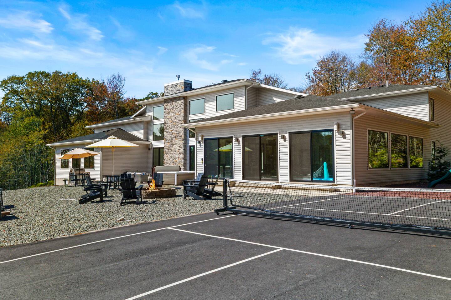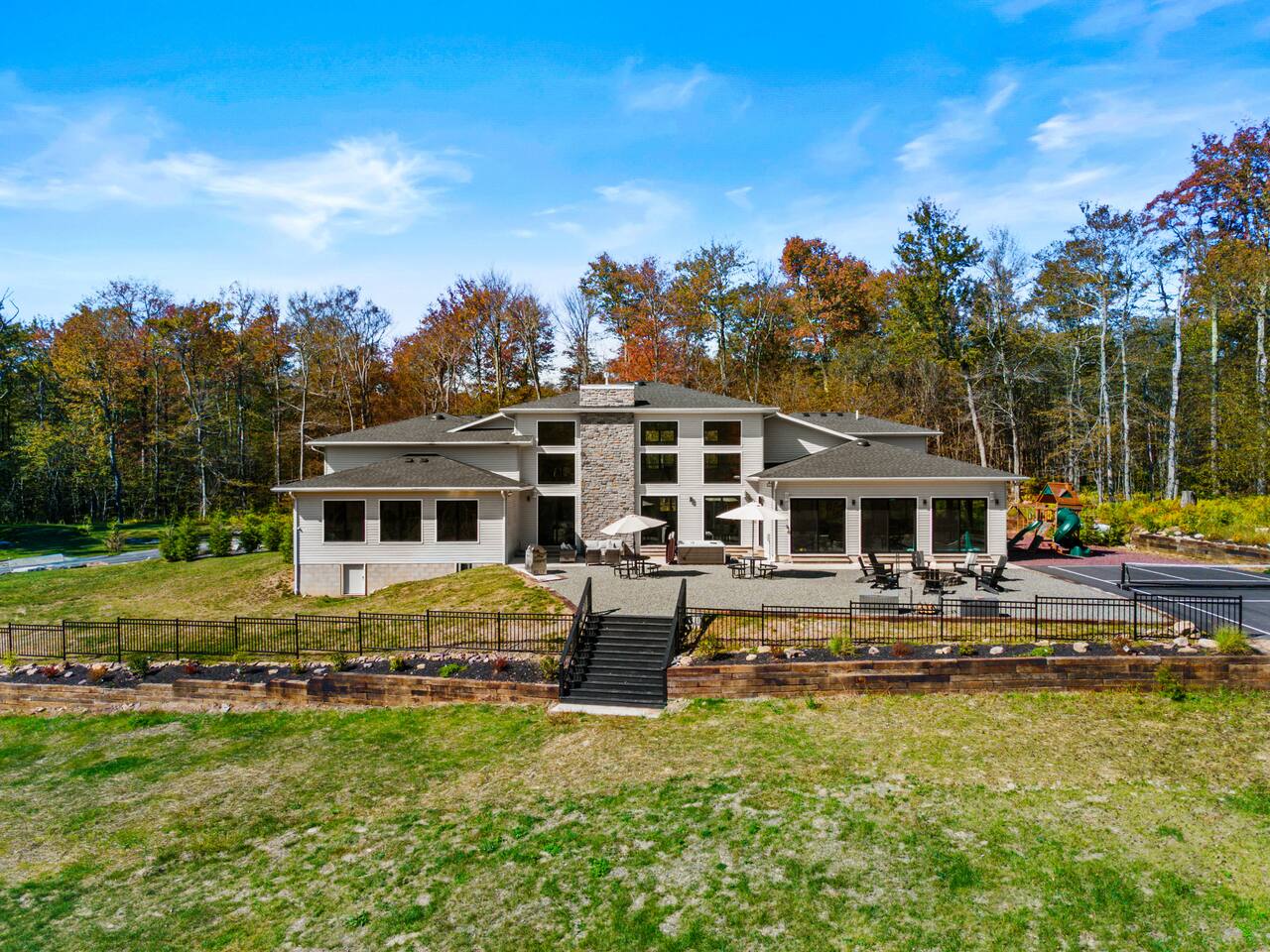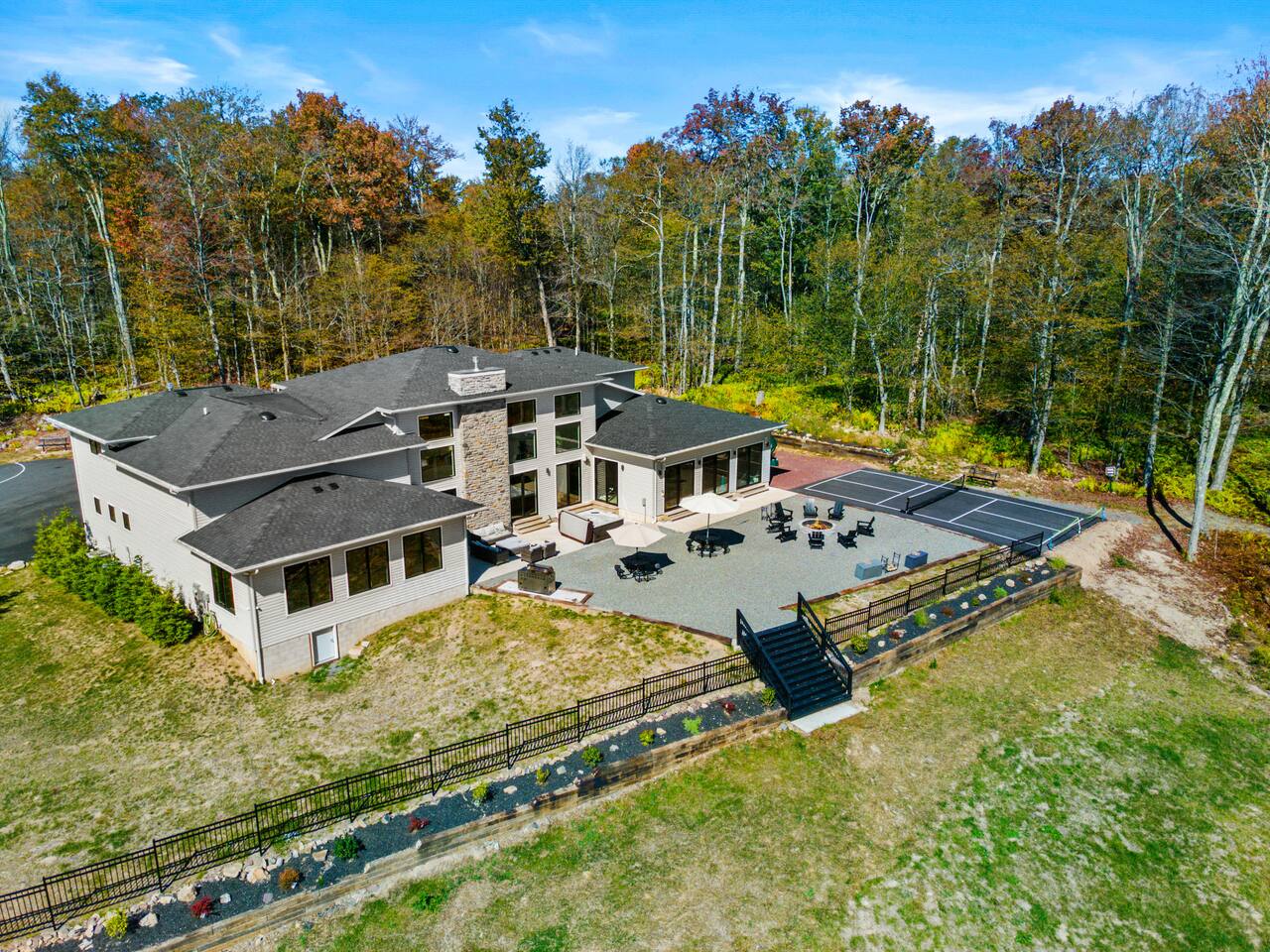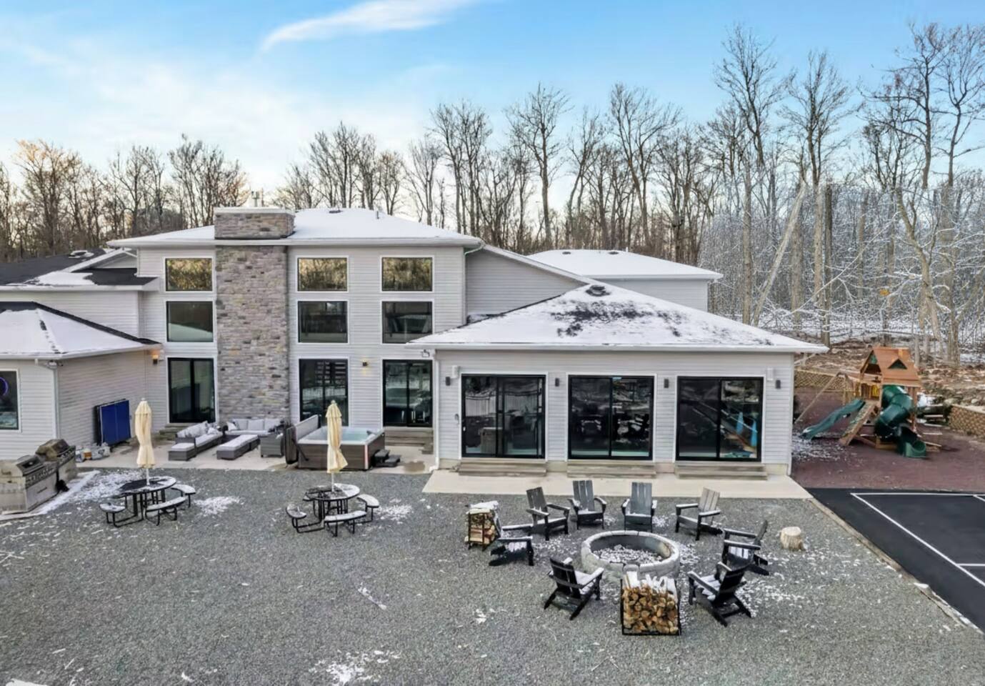 Experience The Perfect Pocono Escape—your private luxury retreat. This stunning estate offers year-round relaxation and entertainment, featuring an indoor heated pool and hot tub, a cutting-edge arcade, and a state-of-the-art 22-seat movie theater. Step outside to enjoy a second 7-person hot tub, a private walking trail, pickleball court, fire pit, and a children’s playground. True to its name, The Perfect Pocono Escape delivers an unforgettable experience in every season.